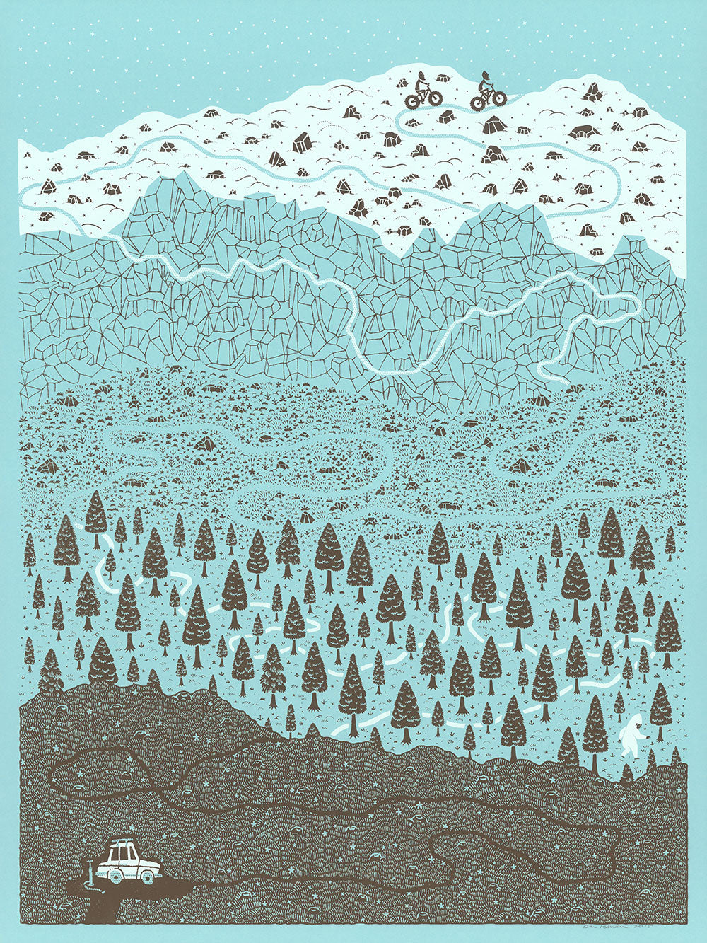 This is a variation of my poster ‘First on the Trail’. While I altered details within the illustration the original idea remains: Two cyclists on a journey through five unique landscapes including mesa, forest, alpine tundra, high alpine, and snowy peaks, all of which can be experienced in my home state of Colorado.