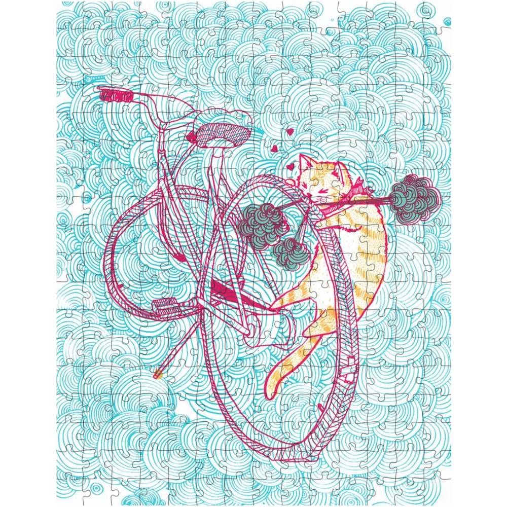 ABOUT THE ART: My cat Bebe loved to bite everything when she was a kitten. So when my friend suggested “a bicycle built for Bebe” theme, I thought, “Bebe wouldn’t ride a bicycle, she’d bite it.”